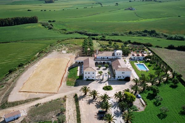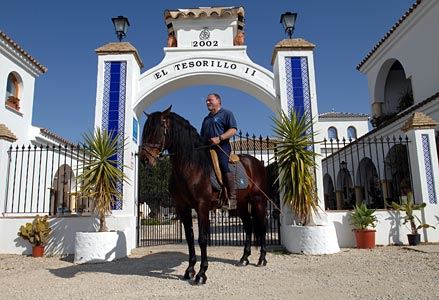 Ein Landhotel und Hacienda in malerischer Umgebung in Verbindung mit der Aufzucht und Dressur der aller schönsten und begehrtesten Pferde Spaniens. Der Reitplatz (60 x 24 mtr.) mit Panoramablick auf das Gebirge ist ausgestattet mit Beregnungs- und Flutlichtanlage. Der Unterricht erfolgt in deutscher Sprache, die Anweisungen werden leicht verständlich per Headset mittels Lautsprecheranlage übermittelt. So muss man sich nicht auf den Lehrer konzentrieren, sondern kann all seine Aufmerksamkeit dem Pferd widmen.